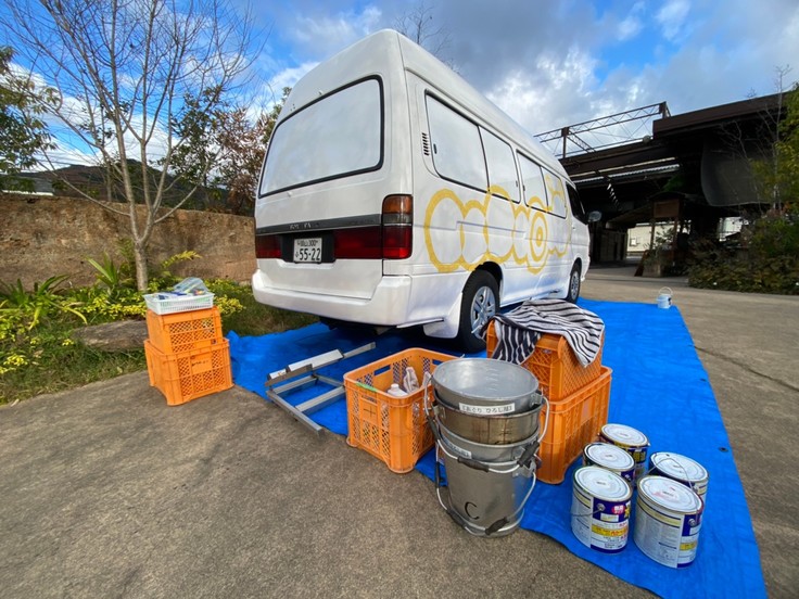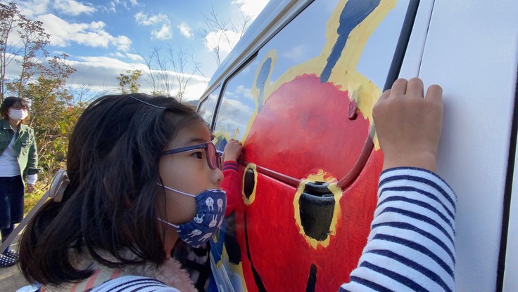 先週に続き、アートグループmoさんを先生に迎え、車体をペイントするイベントを開催しました。今回は反対側にNPOのマスコット的なキャラクター『あぐりんちょ虫』をみんなで描きました!