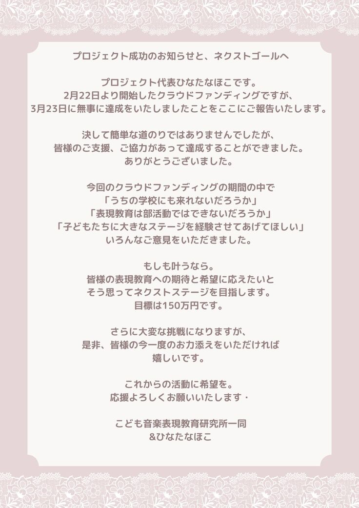 プロジェクト目標金額100万円を達成いたしました。本当にお力添えありがとうございました!
