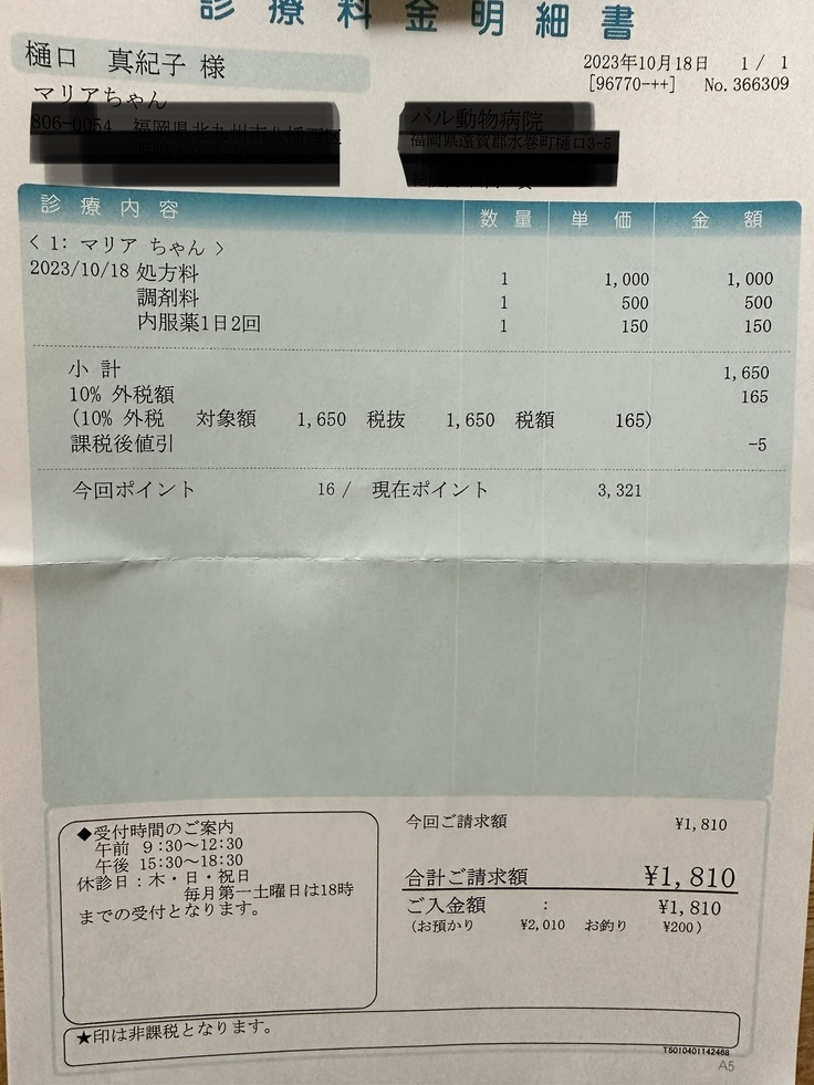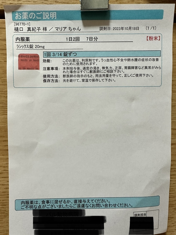🔴10/18朝から尿量が20g、お腹も張っていて心配なので、夕方担当の獣医師に連絡して利尿剤を処方してもらいました。