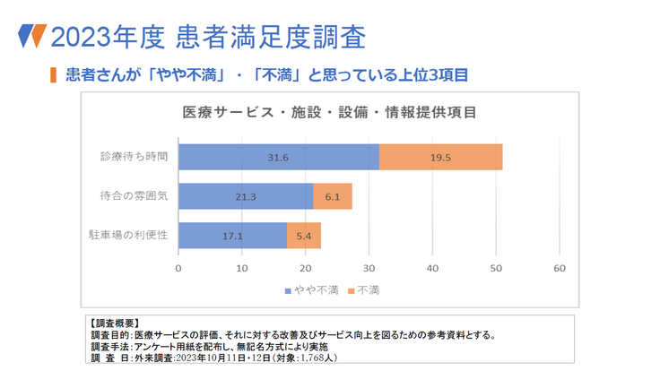 例年、当院では患者満足度調査を行っておりますが、調査結果では、患者さんが改善を求めている項目として「診療待ち時間」「待合の雰囲気(環境の充実)」等の項目が上位を占めており、その多くが外来診療にあたるものです。