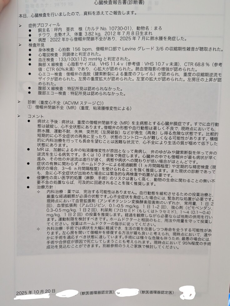 心臓の手術適応かどうかの検査を行う。検査の結果心臓以外の異常は見られず、先生からは現在ステージCであること、手術は今がベストであると説明を受ける。