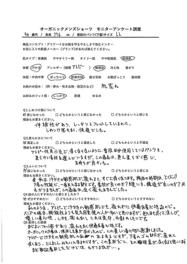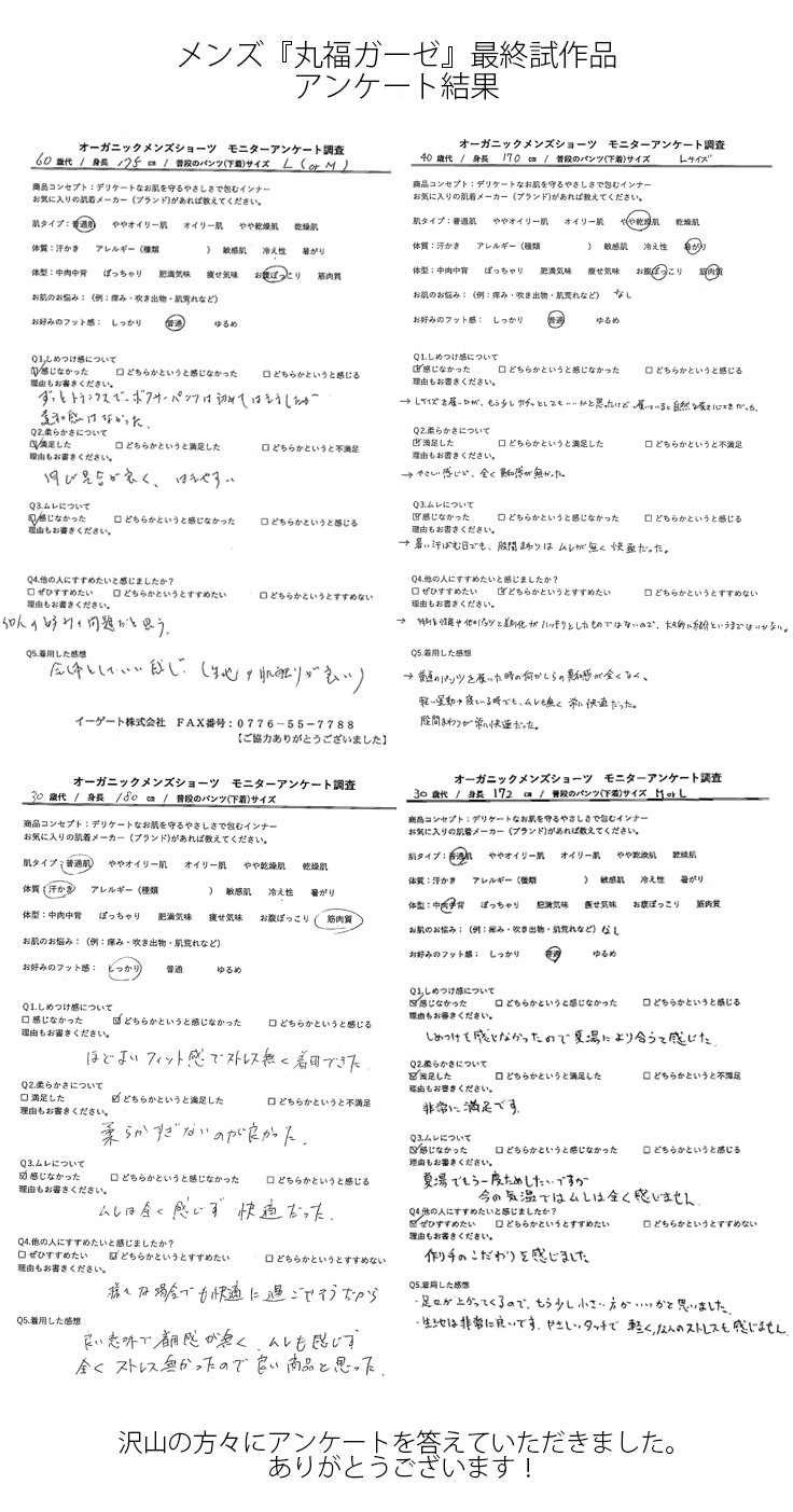 実際に、肌のデリケートな方など多くの男性に最終の試作品を実際に1週間履いてもらってアンケートを実施。おかげさまで大変高評価を頂くことができました。