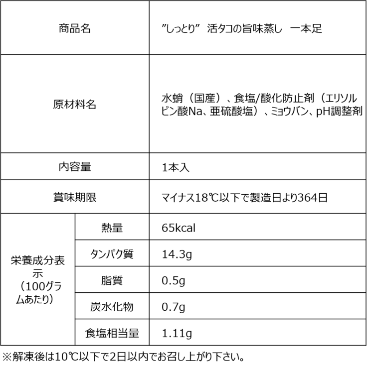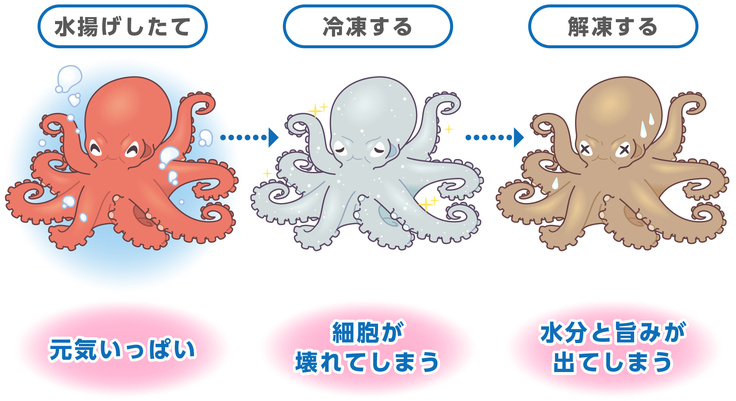 細胞が壊れた状態で解凍すると水分と一緒に旨み成分が出てしまい、結果的に “旨み成分の少ないタコ“ になってしまいます。