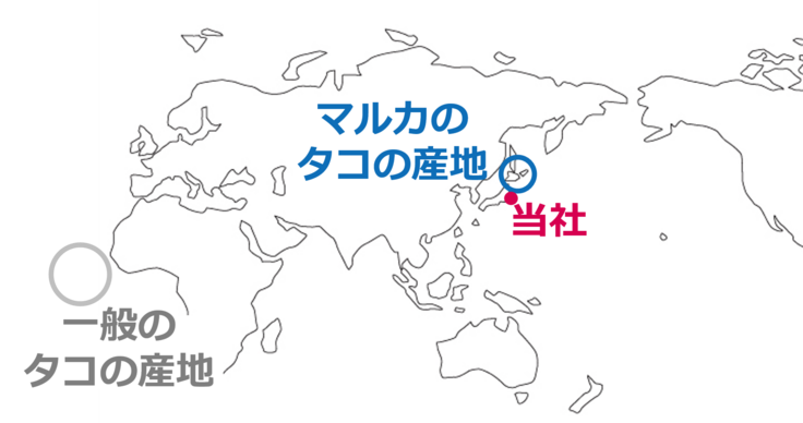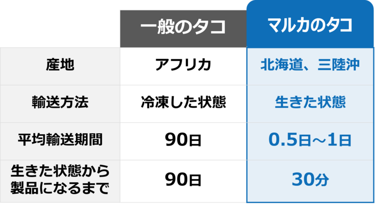 一方で、皆さんの印象とは必ずしも一致しないのではないでしょうか?皆さんが目にすることの多い一般に流通しているタコは、アフリカ沖で水揚げした後、冷凍された状態で数ヶ月かけて日本に輸送されているため、鮮度が落ち、タコ本来の素材の良さがなくなってしまっていることが多いからです。
