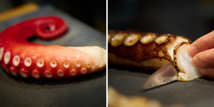 活タコの足を、一本まるごと超高温の直火で焼き上げました。