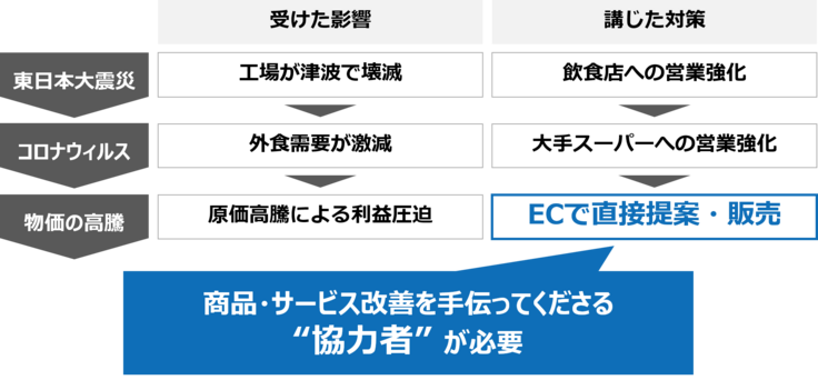 今までスーパーや飲食店などのパートナーを介して消費者の皆さんへ商品を届けてきましたが、素材にこだわった商品の特徴を踏まえると ”ECでお客さまへ商品の価値を正しく提案し、直接届けること” が必要なのだと整理しました。