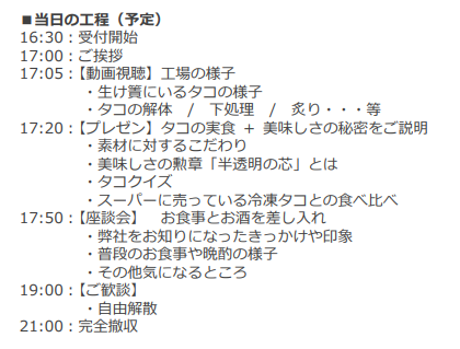- タコや魚に関するトリビア、クイズ、開発秘話、工場の様子などを取りまとめて、メールやお手紙でお送りいたします。