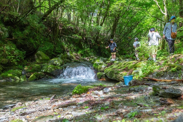 会場の横を流れる枝川川(仁淀川支流)で釣り体験も実施しました。この水がにこ淵や仁淀川に流れる水です。