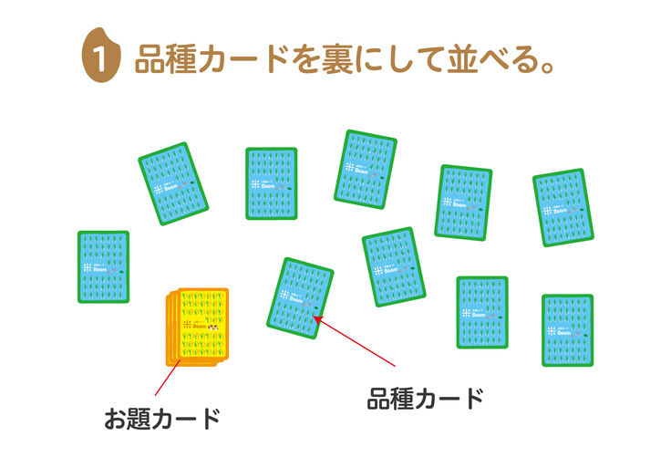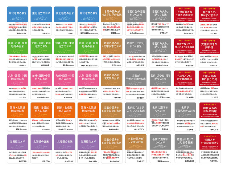 このカードゲームはお米の情報が書かれた「品種カード」45枚と、ゲームに使用する「お題カード」45枚がセットになっています。 この2種類のカードを組み合わせることで3種類のゲームを楽しむことができます。