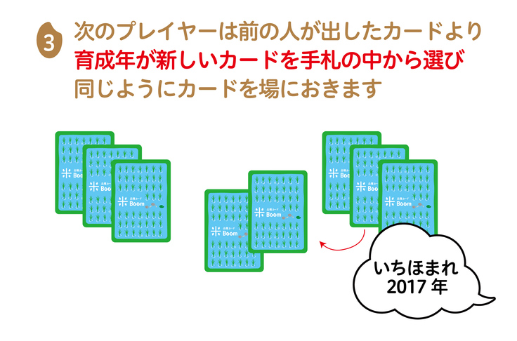②前に人が出したカードと同じ育成年のカードも置くことができます。