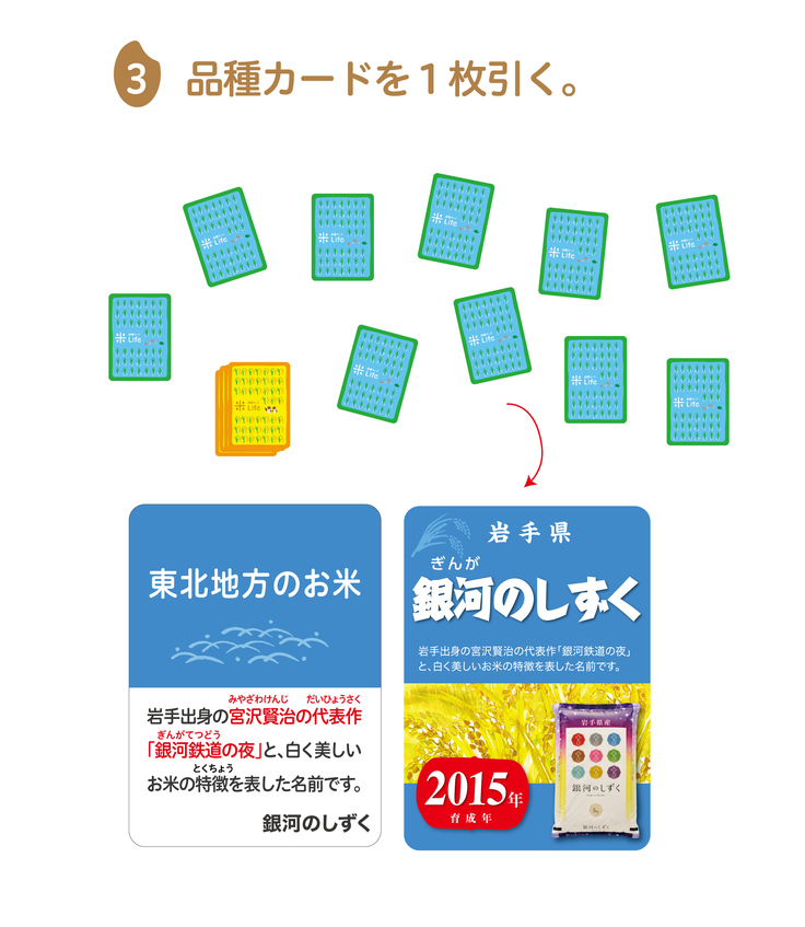 このゲームはお米のことを知らない人だけでも楽しめますが、ゲームにひとりお米に詳しい人がいるともっともっと楽しめます。 ゲームの途中で少し脱線してカードに載っていないお米に関する知識を伝えながら遊んで、ゲームだけでは伝わらないお米の魅力を伝えてあげてください。 ゲームをするだけでは気づかなかったお米の魅力にきっと気づくことができるでしょう。