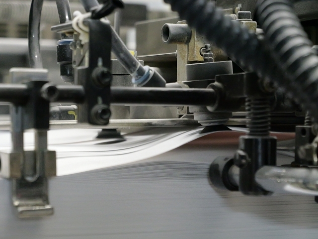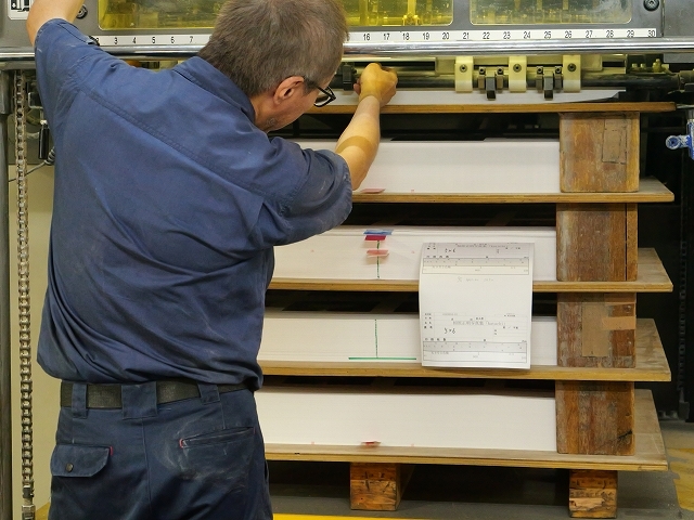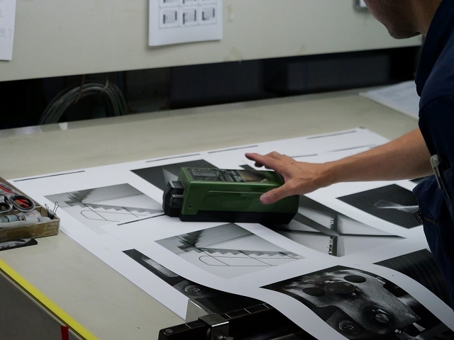 OKが出ると、印刷を開始します。途中何枚か抜き出して、計測器で印刷の匠が濃度等をチェックします。印刷機紙挿入口に、紙がセットされてバキュームで吸い上げ、猛烈な勢いで、印刷機の中吸い込まれて行きます