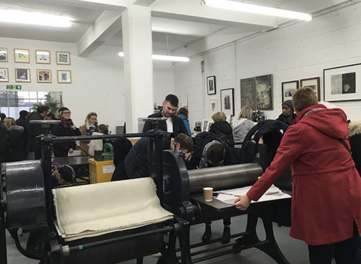 共同のアトリエで制作するアーティストは工房に立ち入ったり、プレス機