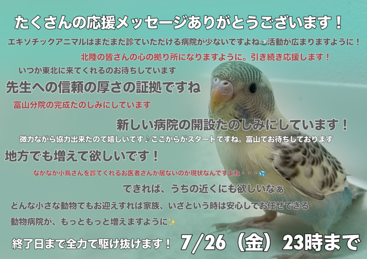 終了日までたくさんの方に当院を知っていただき、動物種ごとに必要な知識をつけ防げる病気になる子を減らしていきたいです!
