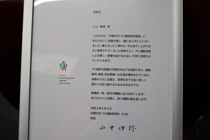 皆様のご支援のお陰で先日京都大学iPS細胞研究所に500,000円のご寄付をさせて頂く事が出来ました。今後研究が進み、現在苦しんでいらっしゃる皆様が一日でも早くその苦しみから解放される事を願って止みません。