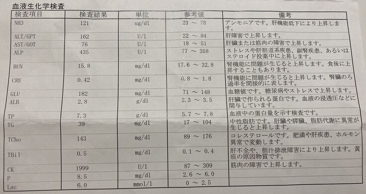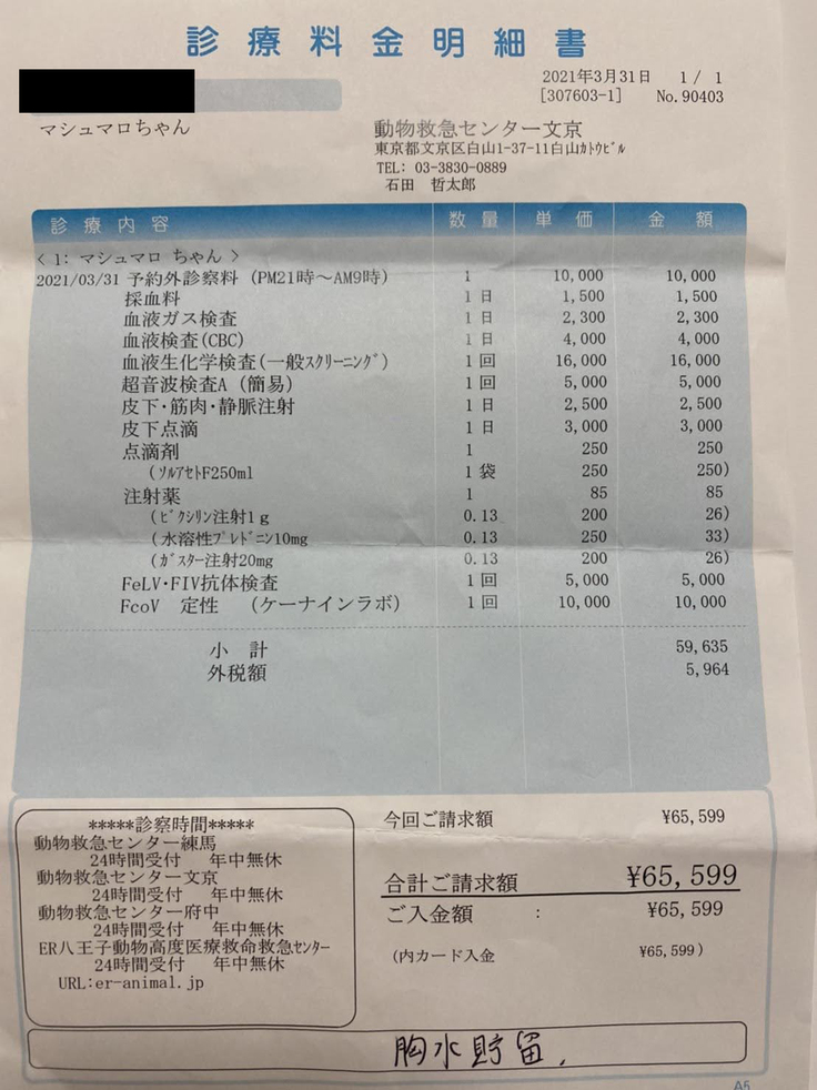 夜間緊急病院では、血液検査と胸水除去を行いました。