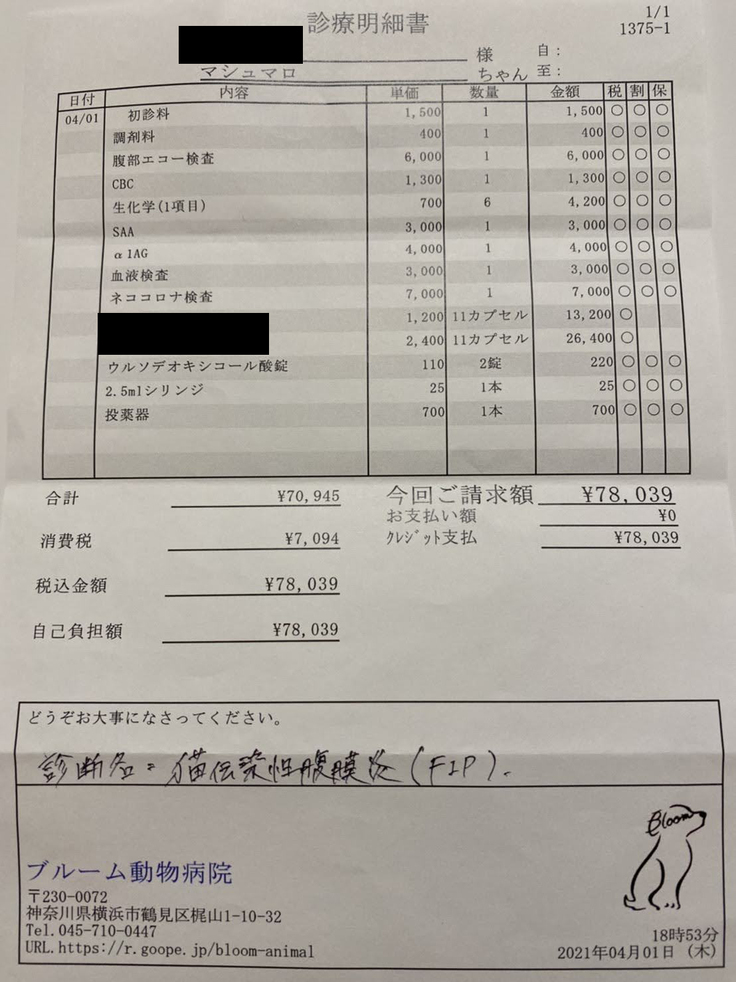 「FIPの場合、予後が非常に悪い。完治は難しい。」と告げられました。