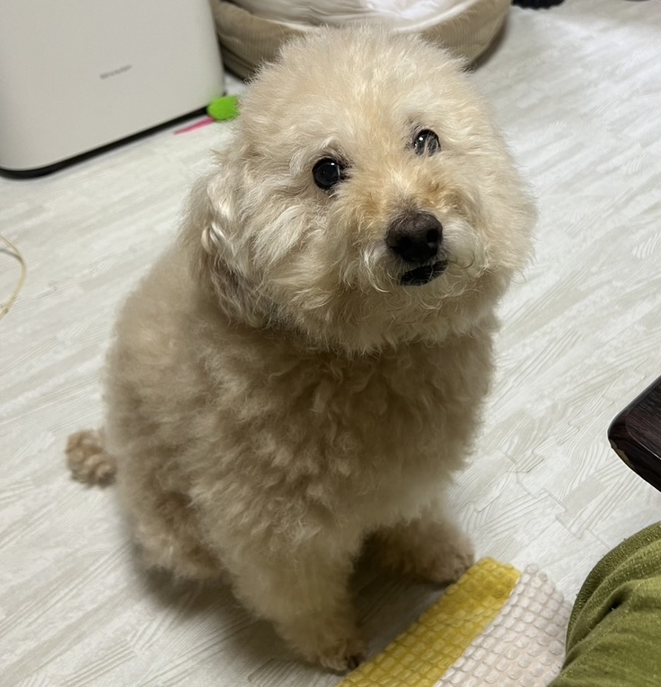 おやつが欲しくて無言の圧をかけてくるましゅうくん。太っちゃダメなのでほどほどにです…