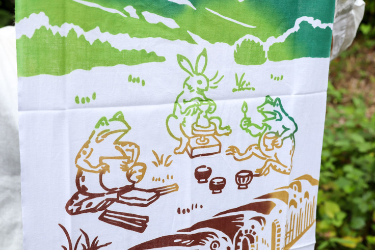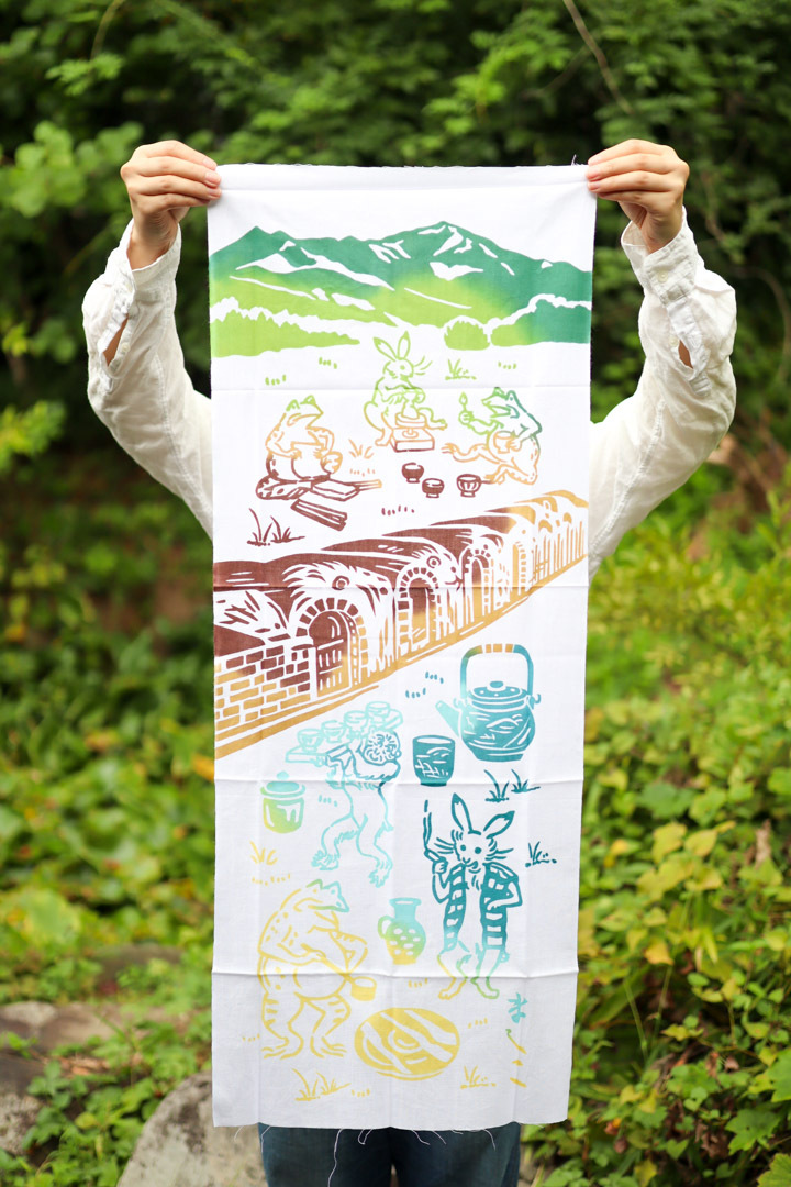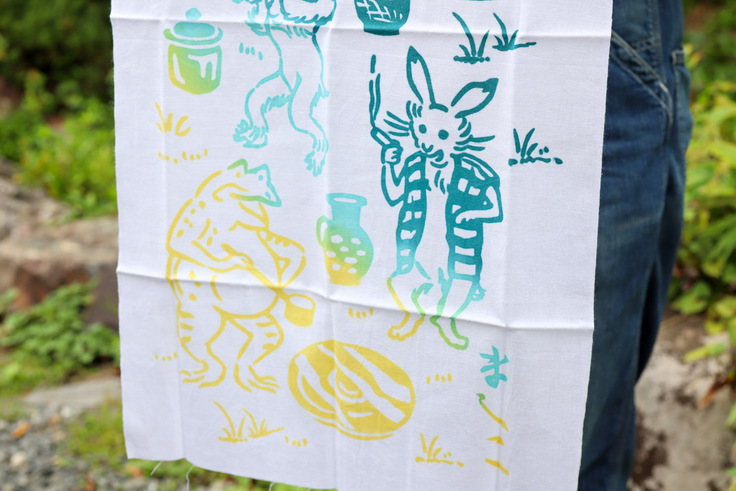 今回は特別に、染織家・下平清人さんに「ましこ」の文字を彫っていただき、鳥獣戯画のカエルとうさぎが陶工となって窯場で働く姿を描いた、ユーモラスで愛らしい図柄を添えました。