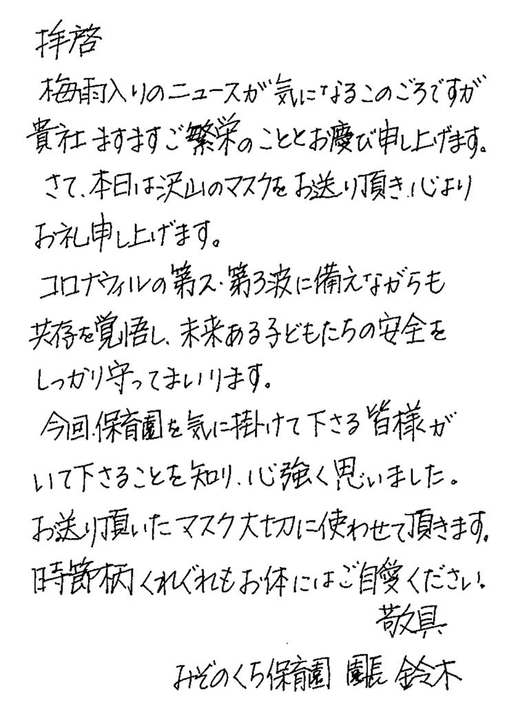 この度のプロジェクトで姉妹園分も含め、マスクを頂きありがとうございます。
