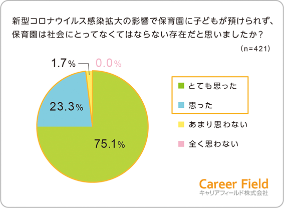 保育者向けの求人サイトを運営するキャリアフィールドさんの調査結果では、新型コロナウイルス感染拡大を受けて、保護者の98%が「保育園は社会にとってなくてならない存在」だと回答しております。