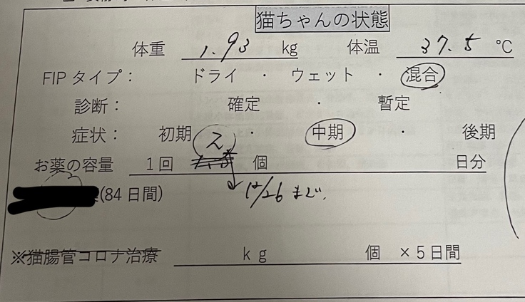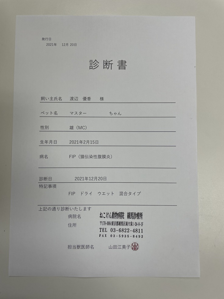 そして、他の病院で診てもらったところFIP(混合タイプ)と2021/12/20に告げられました。