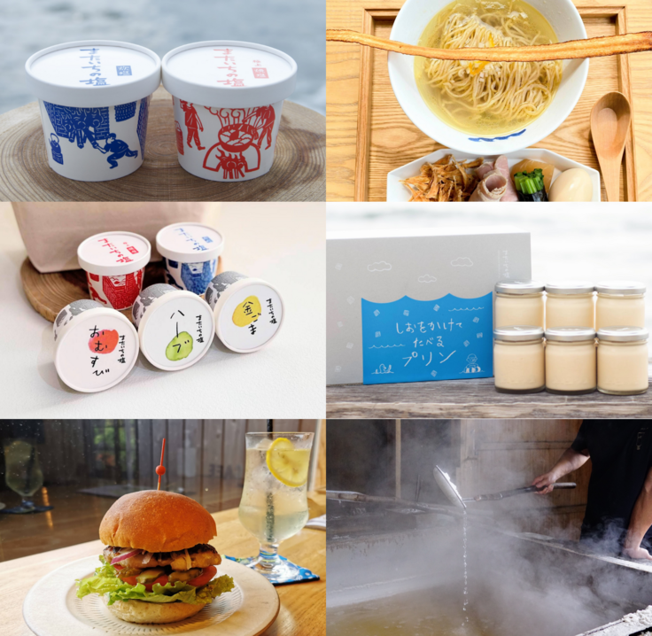 今回のクラウドファンディングでは、「またいちの塩」の様々な塩や「しおをかけて食べるプリン」のセット、また弊社が運営している飲食店おしのちいたまの塩そば、sumi cafe(スミカフェ)の塩豚バーガーセットをご用意いたしました。