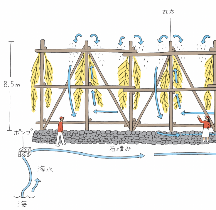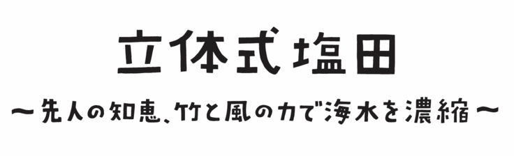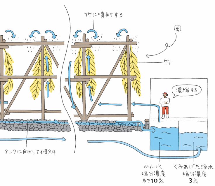 「またいちの塩」は、まず竹を逆さに吊るした櫓(立体式塩田)に汲み上げた海水を循環させ、10日間くらいかけて塩分濃度を上げていきます。そして、塩分濃度3%の海水を9%、10%と3倍くらいに濃縮させたら釜に移して炊きます。塩田に竹を使うのは、海水が枝を伝ってゆっくり風と太陽の光を浴びながら落ちることで塩分濃度を上げ、うま味を引き出すためです。