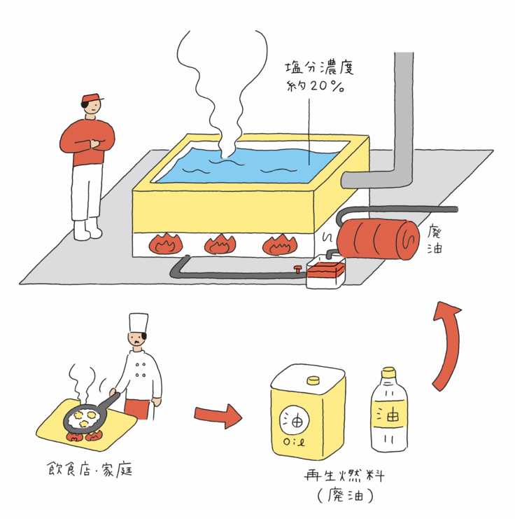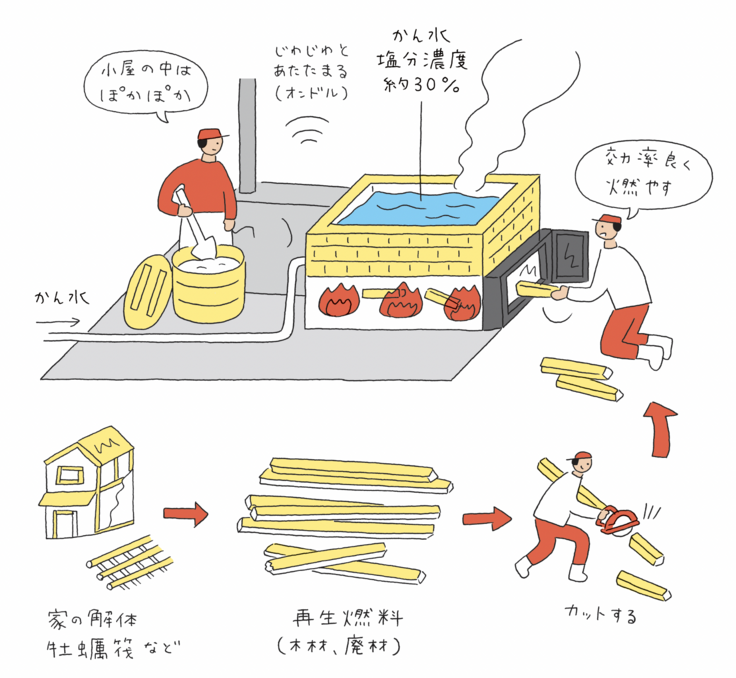塩田で濃縮された「かん水」をじっくり煮詰めて、どんどん濃くしていきます。燃料に使うのは古い家などを解体したときに出た廃材や、飲食店や家庭で出た食用油を再利用した廃油。少しでも無駄のない持続可能な塩づくりを続けています。
