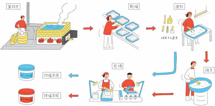 海水から約20日間かけて釜から塩の結晶をすくい取り、一晩寝かせると塩のできあがり・・・なのですが、職人による手作業は続きます。丁寧に不純物を取り除き、ようやく「またいちの塩」が完成します。