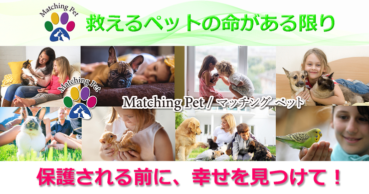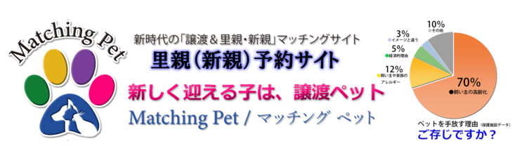 サイト名「Matching Pet/マッチングペット」は、従来の保護ペットの里親探しはもちろんのこと、飼い主の健康不安や年齢的な不安、仕事や生活環境の変化により、ペットの将来が不安な方のために、現状のまま事前に譲渡先/新親を決めて置く事のできる、新しいシステムの譲渡先/新親探しの場を提供いたします。