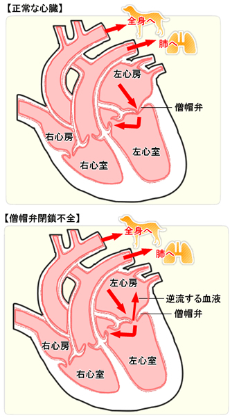 心臓の左心房と左心室の間に位置する僧帽弁(血液を送り出すために開いたり閉じたりする機能を持つ弁)が、なんらかの原因で変性し、閉鎖不全が生じるために起こります。僧帽弁の閉鎖不全が起こると、左心室から左心房へ血液が逆流し血液の循環不全がおこるためさまざまな症状が引き起こされます。