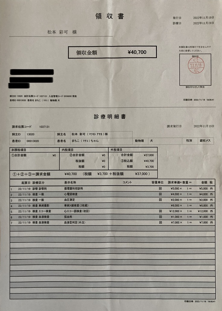 獣医師に伺った所、入院費含め約200万円ということでした。詳しい内訳は決まり次第、明細書と共に速やかにご報告致します。