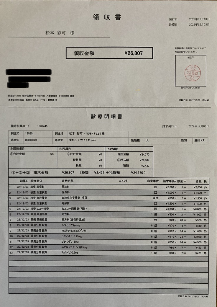 それから半年後の2022年8月、咳が出るようになったことから比較的弱い血管拡張薬であるフォルテコールを処方されました。その時もなぜかレントゲンやエコー検査はしていただけず、少し違和感を感じましたが、まちこが赤ちゃんの頃からお世話になっている先生の仰ることだからと、フォルテコールを服用しながら様子を見ていましたが、咳は一向に治りませんでした。