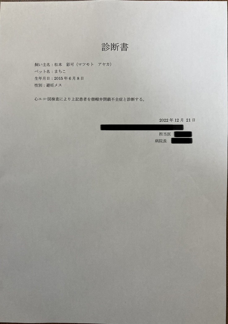 2022年2月、当時通っていた病院での定期診断で心臓に少し雑音があることが発覚しました。