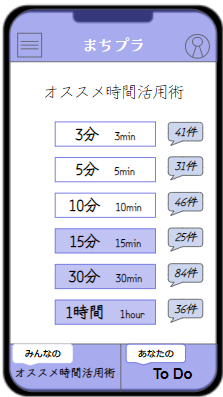 待ち時間を有効活用できるアプリ「まちプラ」は、時間ごとに分けて活用方法を見ることができます。
