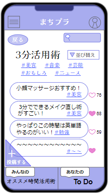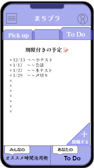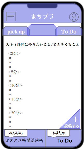 自分の予定とみんなの”活用術”が一度に見れる「まちプラ」があれば、みなさんもスキマ時間をもっと有意義な時間にできるのではないでしょうか?
