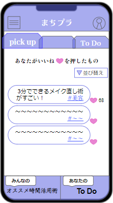 画面右下の「あなたのTo Do」では、自分がハートを押したものが「pic up」として出てきます。「」では自分で時間ごとに分けてスキマ時間にやりたいことを書くことができます。「To Do」には期限付きの予定を書くことができ、期限が短いものから順に表示される仕組みになっています。