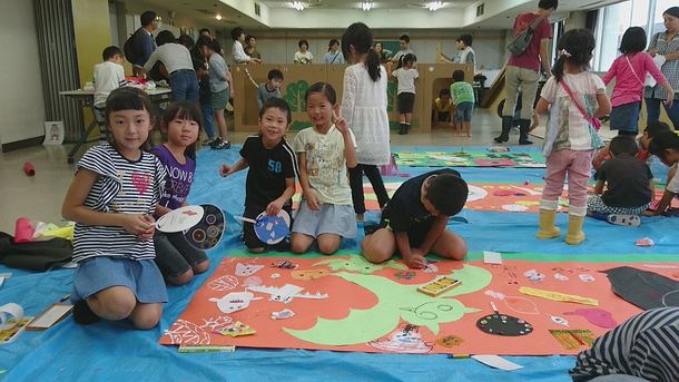 はじめのゲームでつくった4チームに分かれて描いていった壁画はそれぞれの個性が表れてとても楽しそうな仕上がりに。中には何枚も紙を重ねてお化けを作る子がいたり、自分の家から持ってきた可愛い色紙で細かな飾りを作る子がいたり。