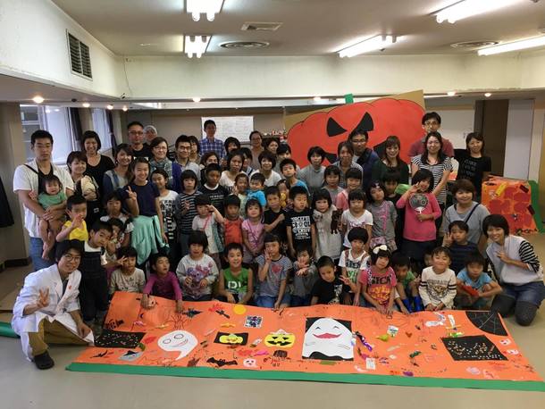 プレイベントとして「ハロウィン巨大迷路ワークショップ」を開催しました!外はどしゃぶりの雨の中キャンセルは一人もなく、子どもたち約40名とお母さんお父さんに参加していただきました。