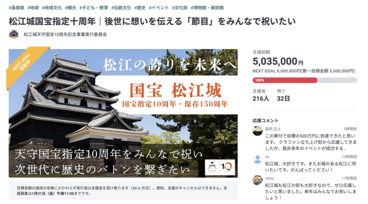 そのため、ネクストゴールを800万円と掲げ、挑戦を続けさせていただくことを決めました。いただいたご支援は、さらに松江城天守国宝指定10周年を盛り上げるための費用として大切に活用させていただき、実施内容についてはご支援の総額と見積もりに応じて決定させていただきます。