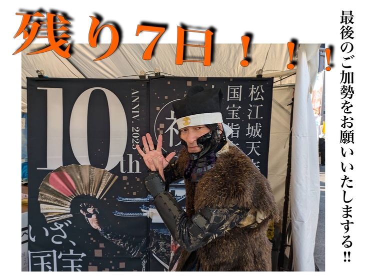カウントダウン写真は、まつえ時代人「楠馬之介」です。横浜のお城エキスポに1回目から参加しており、松江開催に並々ならぬ闘志を燃やしています!