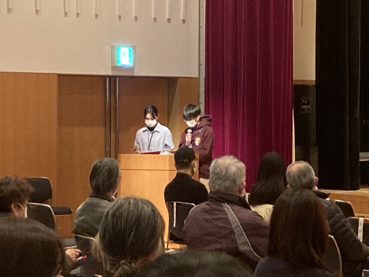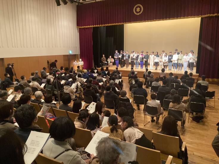 完成上映会の司会進行はまつもとフィルムコモンズの学生メンバーが担当。音楽演奏付きの初回は伊佐治裕子教育長によるご挨拶の後、信州大学グリークラブによる『ふるさと』の合唱、BGMを制作した松本市在住のデュオ「3日満月」による8mmフィルムの映像に合わせた即興演奏、信大生の調査で発掘された「幻の市歌」の合唱と演奏(by 3日満月×信大附属松本中学校2年B組の皆さん)、最後は登壇者・来場者全員による県歌『信濃の国』の合唱で会場が温まりました。