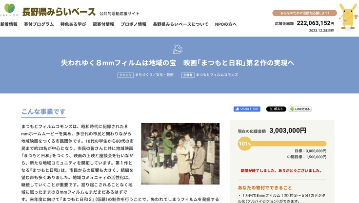8月からスタートしていた寄付サイト「失われゆく8mmフィルムは地域の宝 映画『まつもと日和』第2作の実現へ」が、12月25日をもって、無事目標金額に至り、終了いたしました。