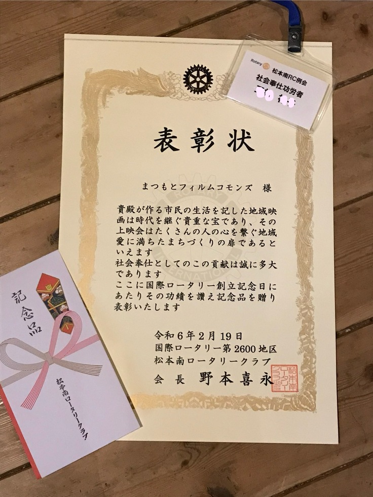 なんと「松本南ロータリークラブ」より、表彰いただきました。