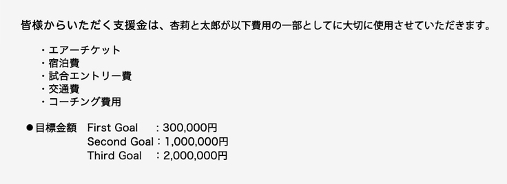 松野杏莉・太郎が、いただいたご支援金を松野姉弟2人分の・エアーチケット・宿泊費・試合エントリー費・交通費・コーチング費(2025年7月末まで)の費用の一部として使用させていただきます。