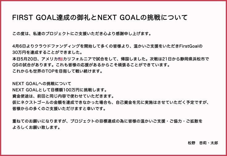 このクラウドファンディングとの出会いを通して、ご支援くださった皆様と共に楽しさや喜びを分かち合えることを心より願っております。今後とも松野姉弟を応援して下さい。よろしくお願い致します。