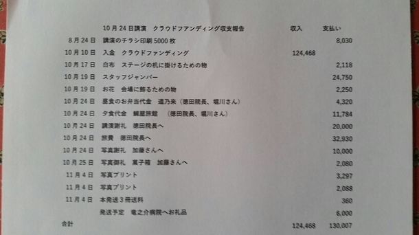 10月24日の講演の収支報告が大変遅れてしまい申し訳ありません。