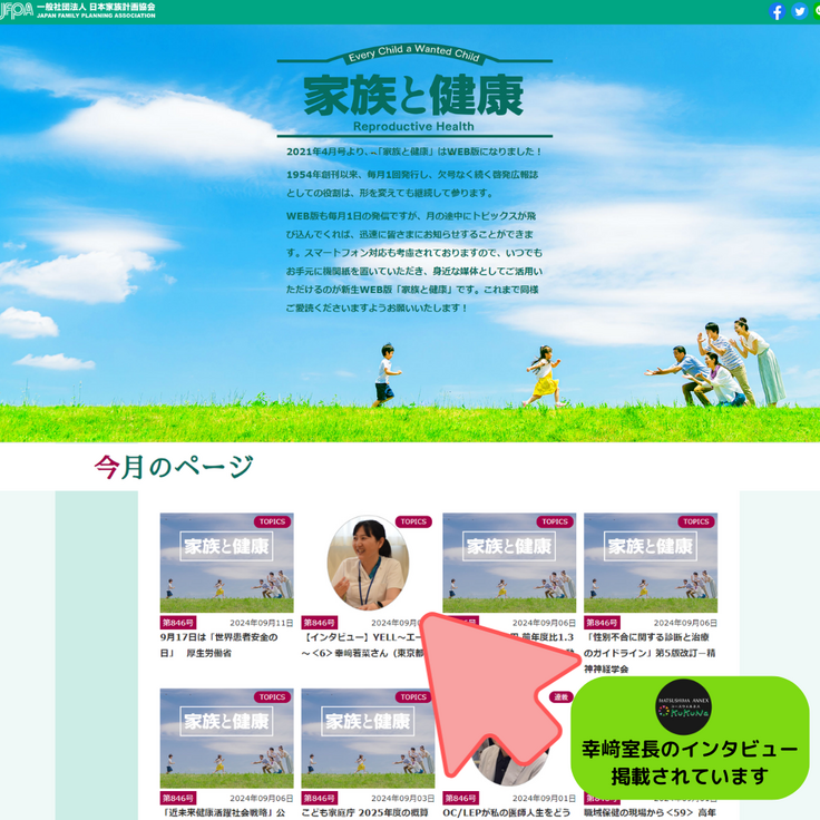 ユースウエルネスKuKuNa室長 幸﨑のインタビューが一般社団法人日本家族計画協会『家族と健康』の今月のページに掲載されています。