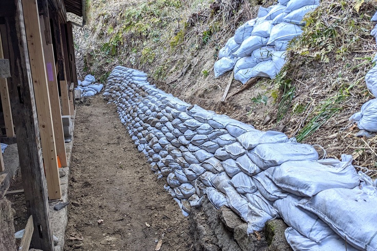 法面との幅が狭く、風通しが悪いことも建物が傷む要因と大工さんに教えて頂き、土のうを積むことにしました。約700個作り、壁との幅を1m空けて積み上げました。